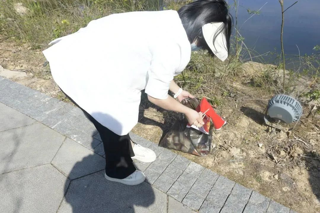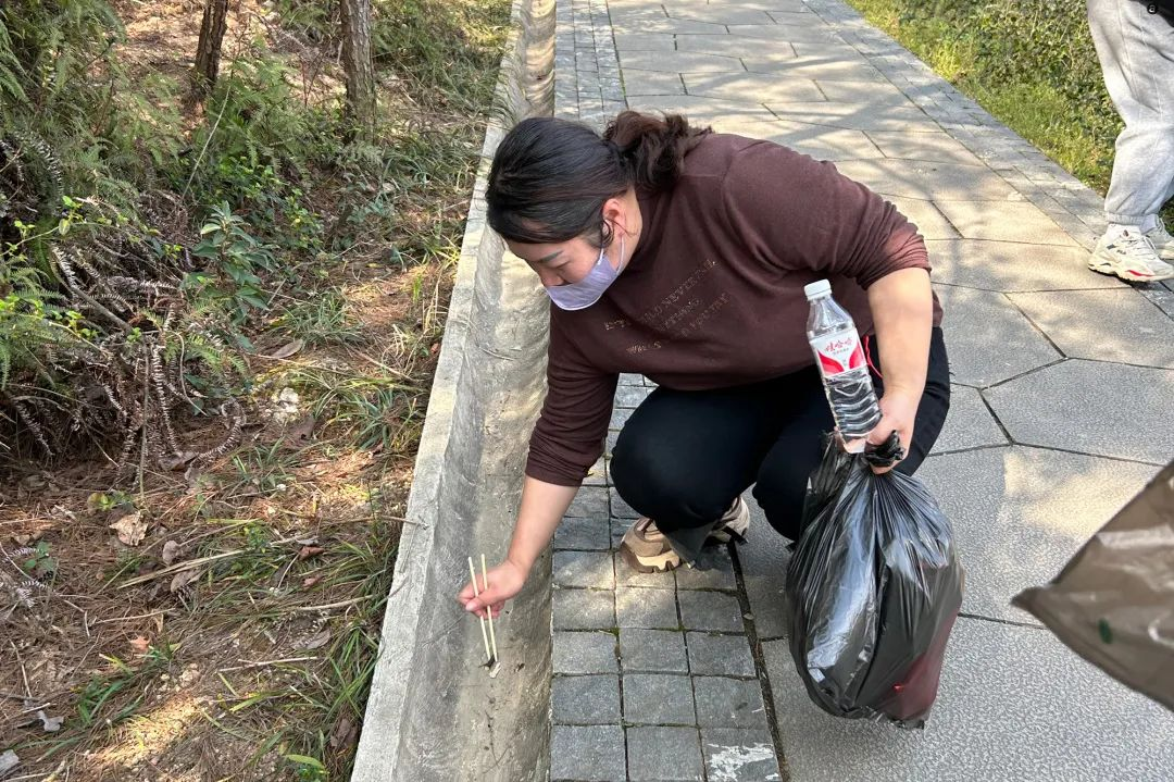 登山途中,大家自觉捡拾垃圾,她们以这样小小的善举,为环保出一份力,为风景添一分美。